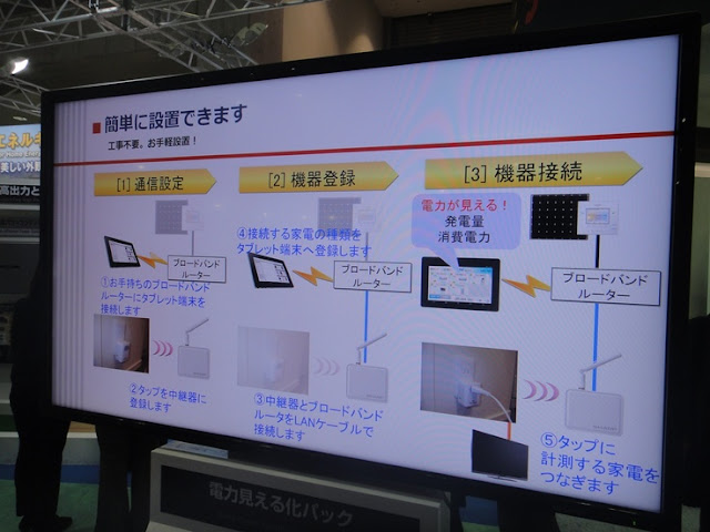 "As you can see on the wall, there's a white box plugged into the socket, which measures power consumption. For example, over there, the TV's power consumption is being measured, and the measured data is sent by wireless connection to this tablet, so you can see how many watts the TV is using. This is the system we've developed, and we're now working on a commercial version."